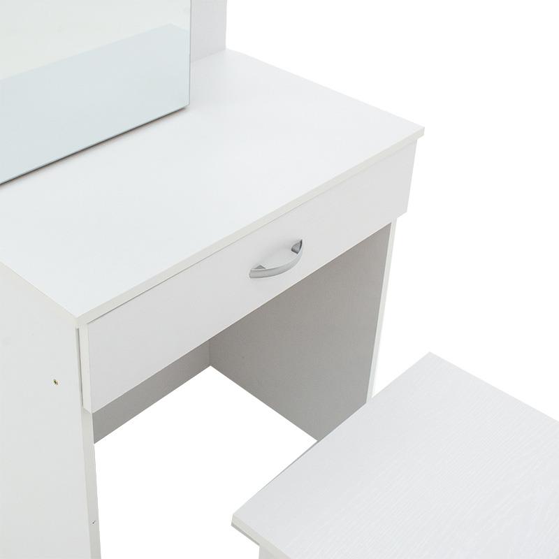 Η τουαλέτα κρεβατοκάμαρας Zelia είναι μια κομψή και πρακτική προσθήκη στον χώρο σας. Διαθέτει συρόμενο καθρέπτη με αποθηκευτικό χώρο από πίσω, όπου μπορείτε να τοποθετήσετε διάφορα αντικείμενα όπως κοσμήματα, αρώματα και άλλα προσωπικά αξεσουάρ. Τα ραφάκια στο πλάι της κονσόλας καθώς και ένα συρτάρι που διαθέτει σας προσθέτουν επιπλέον αποθηκευτικό χώρο και σας επιτρέπουν να αποθηκεύσετε προσωπικά αντικείμενα με ασφάλεια και οργάνωση. Το συμπεριλαμβανόμενο σκαμπό σας παρέχει μια άνετη και λειτουργική θέση για να κάθεστε κατά την προετοιμασία σας. Ανανεώστε την αισθητική και την οργάνωση του χώρου σας με αυτήν την κομψή και πρακτική κονσόλα.
