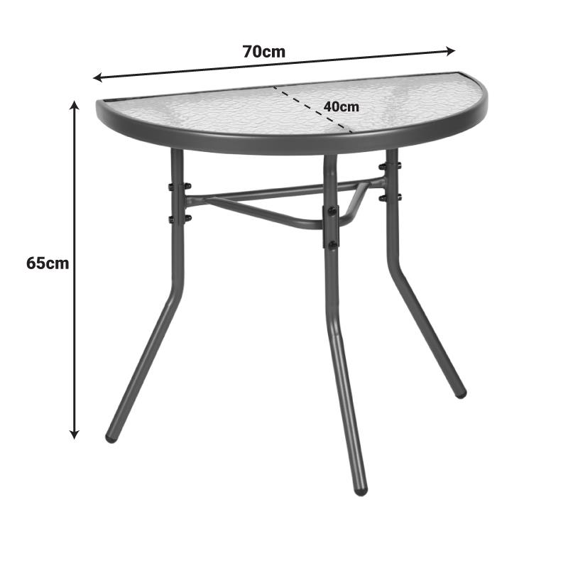 Μετατρέψτε το μικρό σας μπαλκόνι στην αγαπημένη σας γωνιά χαλάρωσης! Το ημικυκλικό τραπέζι Bion είναι ο τέλειος συνδυασμός στυλ και λειτουργικότητας. Ο έξυπνος σχεδιασμός του σάς επιτρέπει να το τοποθετήσετε ακριβώς πάνω στον τοίχο, δημιουργώντας μια φιλόξενη γωνιά για τον πρωινό σας καφέ ή το απογευματινό σας ποτό, χωρίς να θυσιάσετε πολύτιμο χώρο. Η ανθεκτική του κατασκευή με μεταλλικό σκελετό και γυάλινη επιφάνεια το καθιστά ιδανικό για όλη τη διάρκεια του χρόνου.
