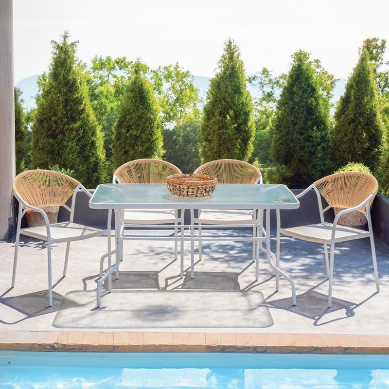 Σταθερότητα και Ασφάλεια: Η γυάλινη επιφάνεια ασφαλείας εξασφαλίζει ότι το τραπέζι είναι ασφαλές για χρήση, ενώ η στιβαρή μεταλλική κατασκευή παρέχει σταθερότητα, καθιστώντας το ιδανικό για οικογενειακές συγκεντρώσεις ή γεύματα στον κήπο.