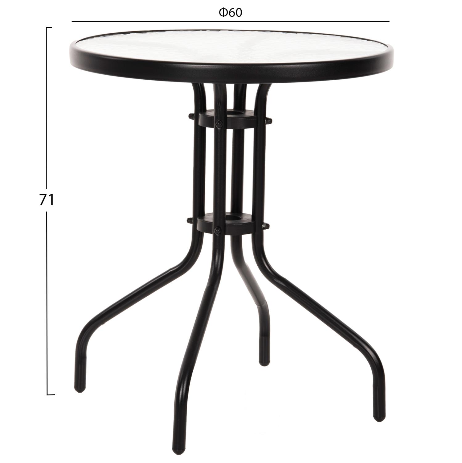 ΗΜ5079.03 ΤΡΑΠΕΖΙ ΣΤΡΟΓΓΥΛΟ γυάλινο-----Το LIMA είναι ένα στρογγυλό τραπέζι με επιφάνεια από ημιδιάφανο γυαλί ασφαλείας και μεταλλικά πόδια σε μαύρο χρώμα. Η γυάλινη επιφάνεια στηρίζεται σε έναν κυκλικό μεταλλικό «δακτύλιο» ο οποίος με την σειρά του στηρίζεται στην διάταξη των ποδιών. Ένα όμορφο και στιβαρό τραπέζι που θα ομορφύνει τον εξωτερικό σας χώρο.