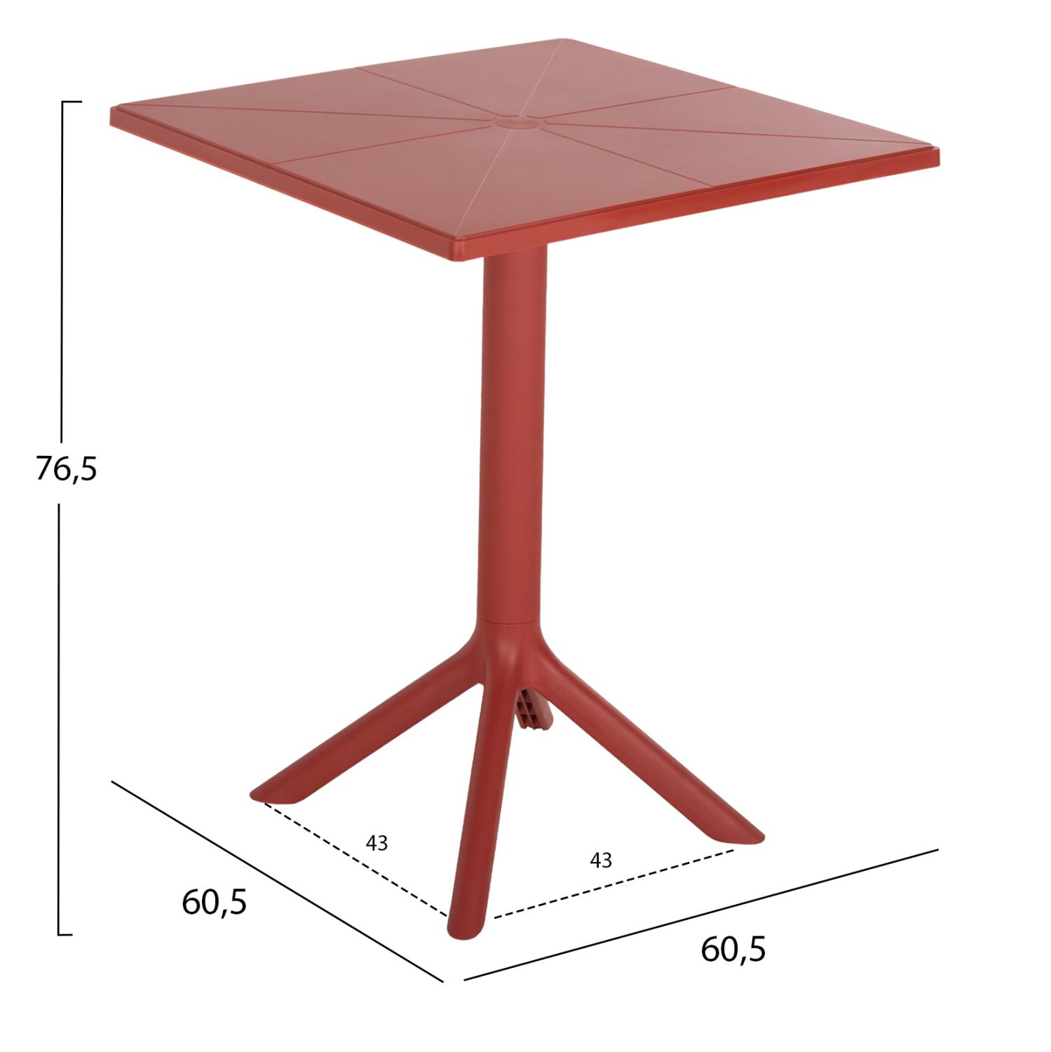 Το τραπέζι πολυπροπυλενίου TERRIN σε ΚΟΚΚΙΝΟ χρώμα είναι η ιδανική πρόταση για χρήση σε εξωτερικούς χώρους, είτε επαγγελματικούς (χώροι δεξιώσεων, εταιρείες catering, κλπ.) είτε για το σπίτι. Το τραπέζι είναι τετράγωνο, ενώ η στήριξη γίνεται με μια κολώνα στο κέντρο που καταλήγει σε 4 πόδια («νύχια»).