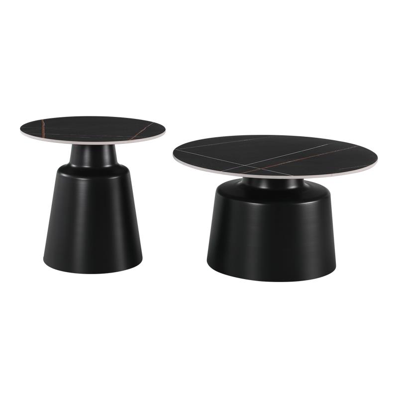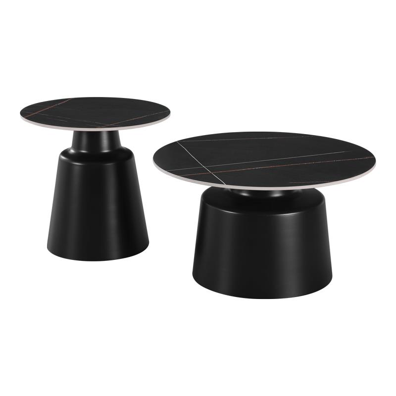 - Η επιφάνεια των τραπεζιών είναι κατασκευασμένη από sintered stone με τα χαρακτηριστικά "νερά" του μαρμάρου σε μαύρο χρώμα, δημιουργώντας μια αίσθηση πολυτέλειας και φινέτσας.