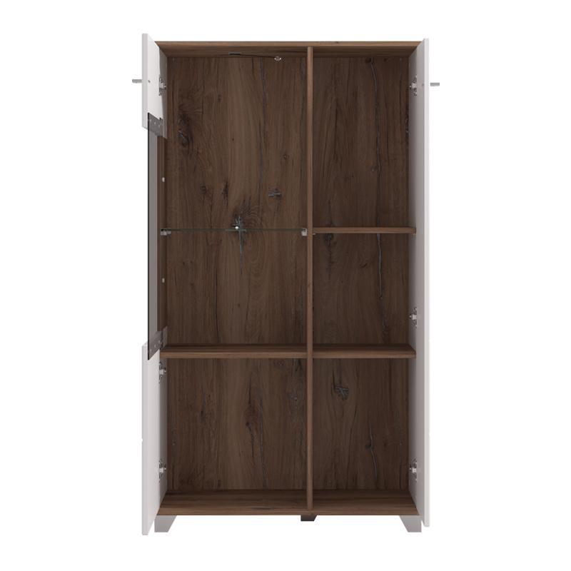 Ο συνδυασμός Flagstaff oak, λευκού και γυαλιστερής μελαμίνης MDF δίνει στη βιτρίνα φωτεινότητα και κομψότητα, ενώ παράλληλα της επιτρέπει να ταιριάξει εύκολα με διαφορετικά χρωματικά μοτίβα στον χώρο. Αν θέλετε να αναδείξετε ακόμα περισσότερο τη φυσική της αισθητική, προτείνουμε να τη συνδυάσετε με υφάσματα και διακοσμητικά σε αποχρώσεις του γκρι, του λευκού ή ακόμα και του πράσινου, που ενισχύουν τη συνολική ισορροπία του χώρου.