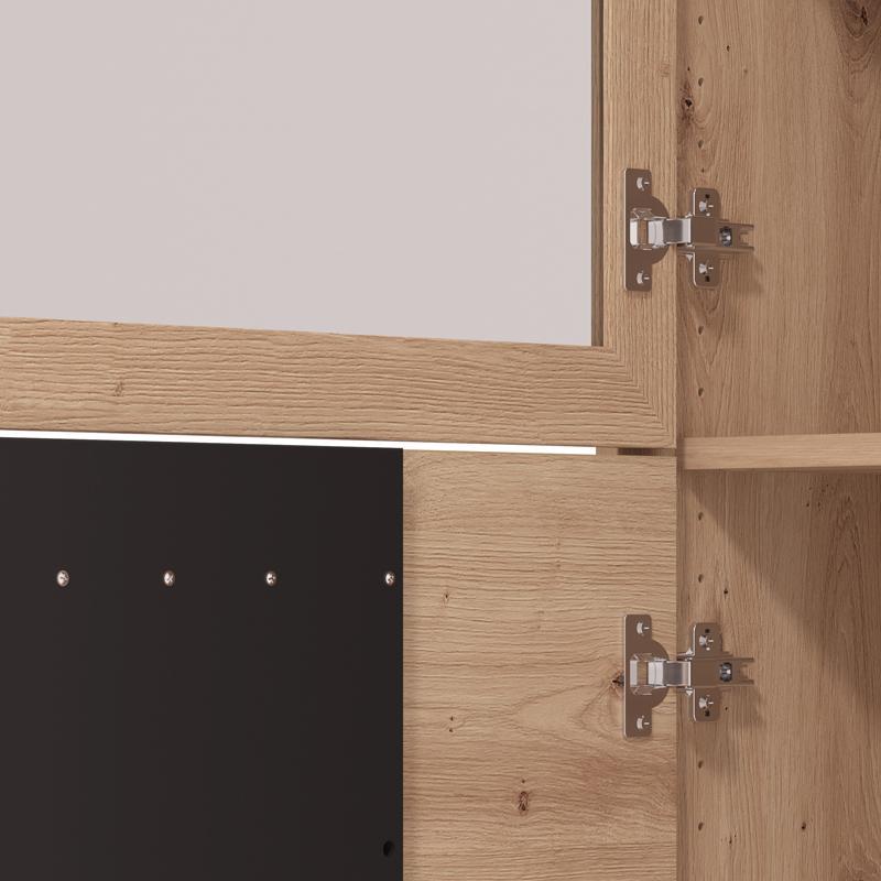 Διαθέτει δύο πόρτες, εκ των οποίων η μία διαθέτει τζάμι, επιτρέποντάς σας να προβάλετε διακοσμητικά, σερβίτσια ή συλλογές με στυλ και στο εσωτερικό της υπάρχουν 3 ράφια, ενώ η κλειστή πόρτα, στο κάτω μέρος, προσφέρει επιπλέον αποθηκευτικό χώρο με ένα ράφι.