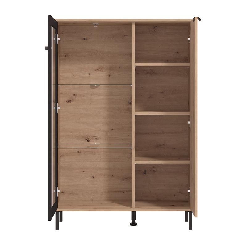 Η βιτρίνα Mayenne διαθέτει πολλαπλά ράφια και ντουλάπια, που σας επιτρέπουν να οργανώσετε εύκολα και αποτελεσματικά τα αντικείμενά σας. Χάρη στον ευρύχωρο σχεδιασμό της, προσφέρει ιδανικό χώρο για την αποθήκευση διαφόρων αντικειμένων, είτε επιθυμείτε να τα έχετε σε κοινή θέα είτε να παραμείνουν προφυλαγμένα πίσω από τις πόρτες της βιτρίνας.